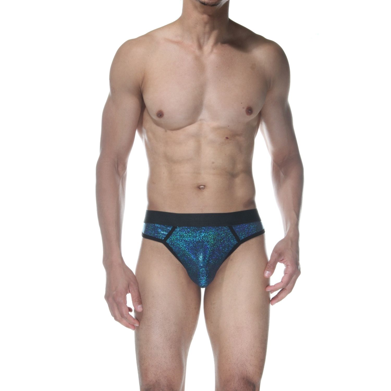 Синие блестящие мужские трусы-стринги.